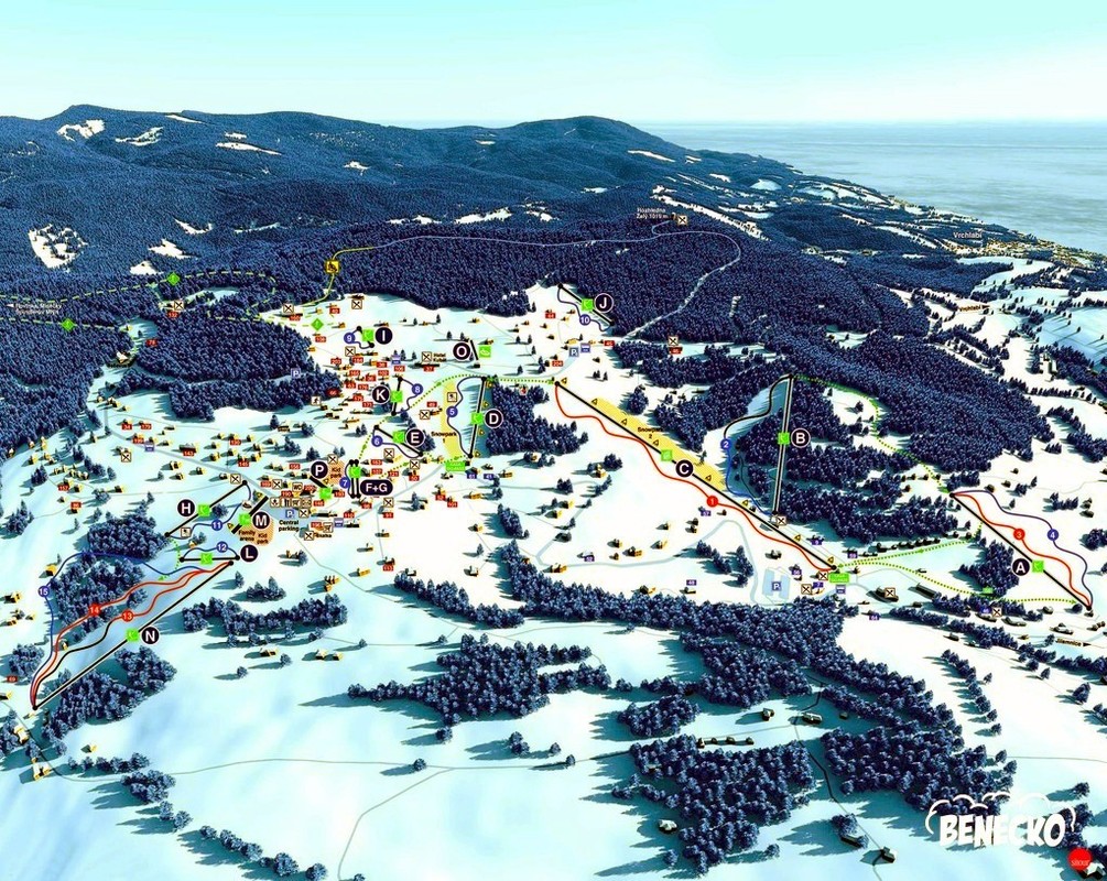 5,5 km svahů pro začátečníky i pokročilé, 16 sjezdovek. Nejdelší z nich, červená, je dlouhá 850 metrů a nabízí i večerní lyžování